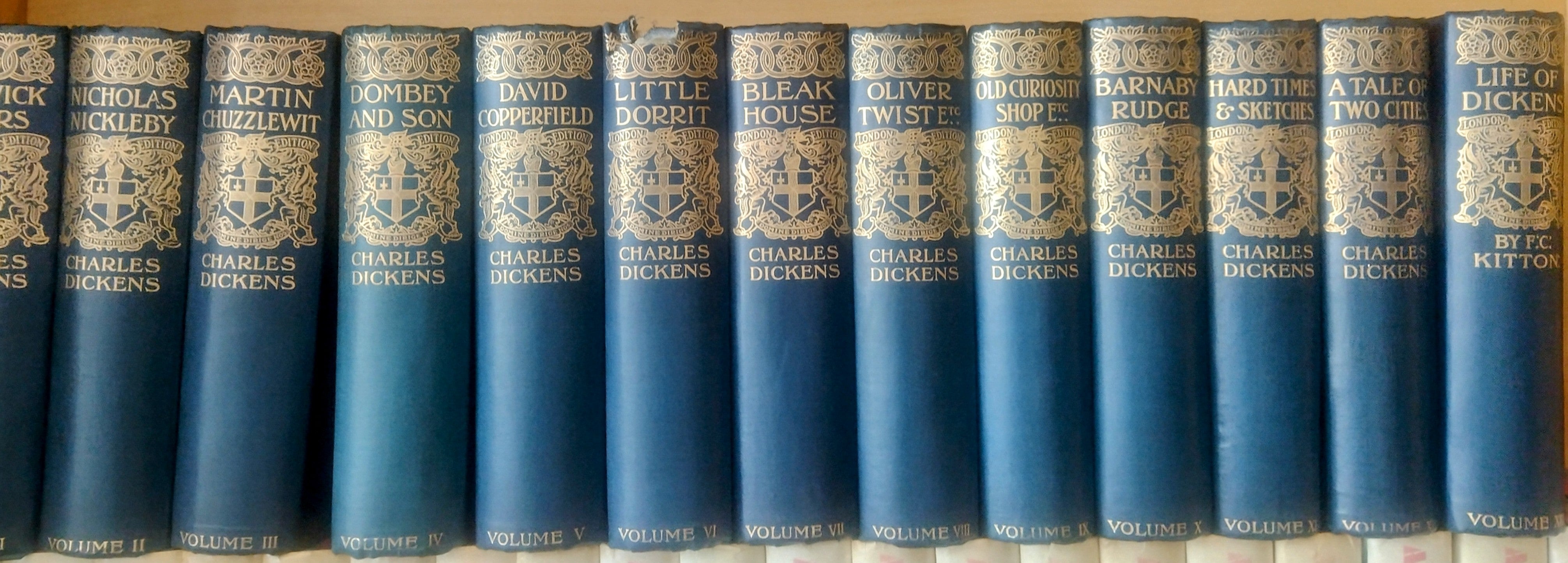 Thirteen volume set, 12 novels and Volume XIII is Life of Dickens by F.C. Kitton. "The London Edition". Identically bound in dark blue cloth with gilt title and decoration on the spines, clean and bright, just some damage to the spine head of Volume VI (Little Dorrit). Hinges and text blocks firm, no inscriptions or book plates. Closed page edges have some light spots, some of which are showing on the inside outer edge of the pages. Each volume has a coloured frontispiece and further illustrations throughout, some in colour by Seymour and Phizz, also by Sibson and Hablot K. Browne. Undated, but potentially circa 1860. The titles are : Pickwick Papers; Nicholas Nickleby; Martin Chuzzlewit; Dombey and Son; David Copperfield; Little Dorrit; Bleak House; Oliver Twist and Christmas Books; Old Curiosity Shop and Short Stories; Barnaby Rudge; Hard Times & Sketches; A Tale of Two Cities and lastly Life of Dickens. A nice good looking set of books. May incur additional postage charges overseas.